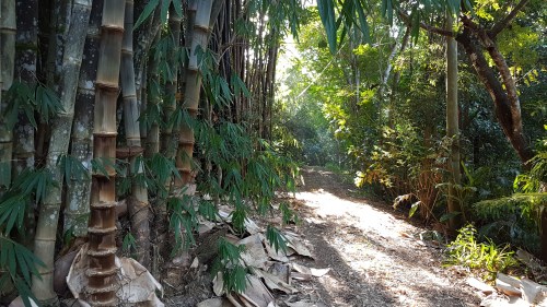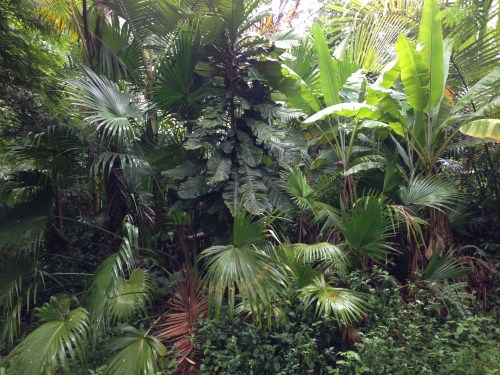 The soil there is volcanic and as rich and brown as chocolate cake mix. Locals joke that you poke a stick in the ground and the next day it’s a tree. The generous rainfall makes everything, including the weeds, grow at a stupendous rate. And so, within a short time, the forest rose up, every year taller and more astonishing. There are now towering quandongs with fat purple fruit, the spotted bark of leopard trees, a tamarind, stands of clumping bamboo, spreading figs and spiky-leaved flame trees, tree waratahs and myrtles, and plenty more whose names I don’t know.