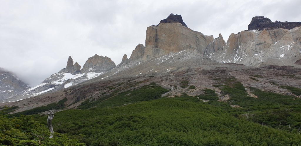 Nearly four hours after leaving the car, we arrive at the Mirador Bas Las Torres, with its famous view of the Torres themselves across the perched lake in front of them. It’s bitterly cold with flurries of snow being blown by the strong wind but we find a sheltering rock, pull up our snoods, and eat apples while enjoying the sheer majesty of it all. It’s an incredible sight, especially as the clouds keep teasing by blocking the whole view and then flying away to reveal the splendour, like curtains coming up on a play.