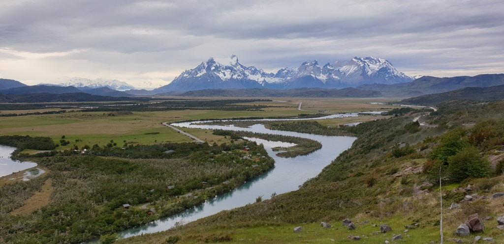 We’re staying at a different hotel tonight, the Pampa Lodge on the Rio Serrano at the edge of the park. It’s a 20 kilometre drive along the usual rough road but it also goes along the straight stretch which gives one of the most iconic views of Torres del Paine, back to the cluster of towering mountains. We have to stop to take it in. It’s Patagonia on a plate.