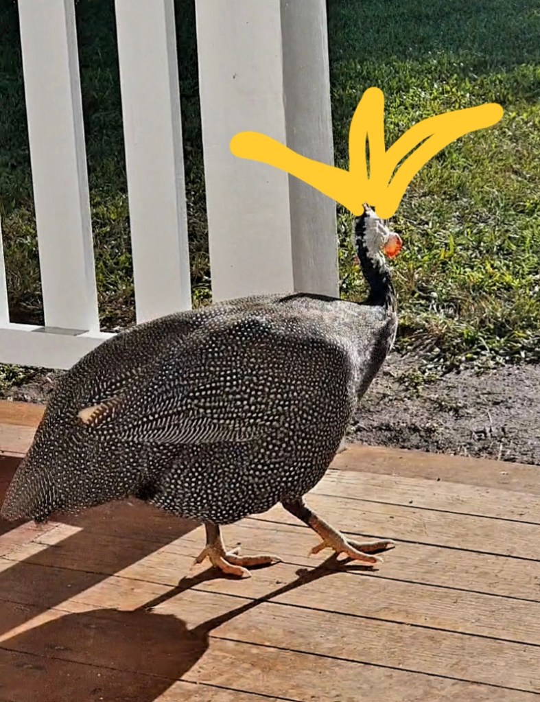 My initial order was for ten but only nine were delivered, barely eight weeks old and more fluff than feather. They had to remain in a coop for at least four weeks but those early days were fraught with anxiety, including an encounter with a hungry python. (That exploit is detailed here.) When they were old enough to be released, I lost a couple to foxes or maybe a goshawk. There were five for a while and then only four. Miraculously, given my record, that guinea fowl quartet lasted for months.